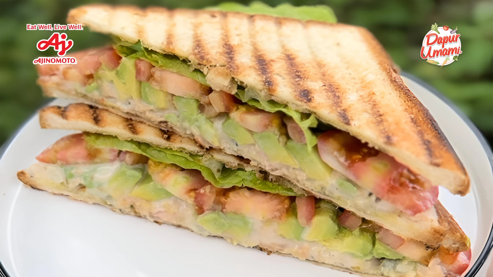 Setelah matang, susun roti dan isian roti Susunan: Roti Pesto Isian tuna mayo Alpukat Tomat Selada Roti